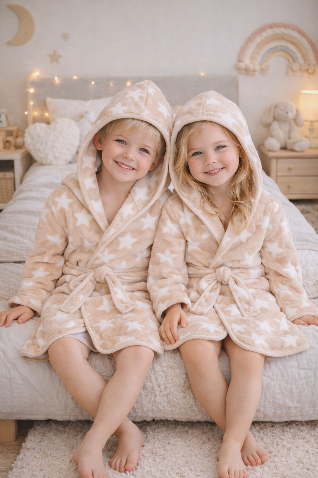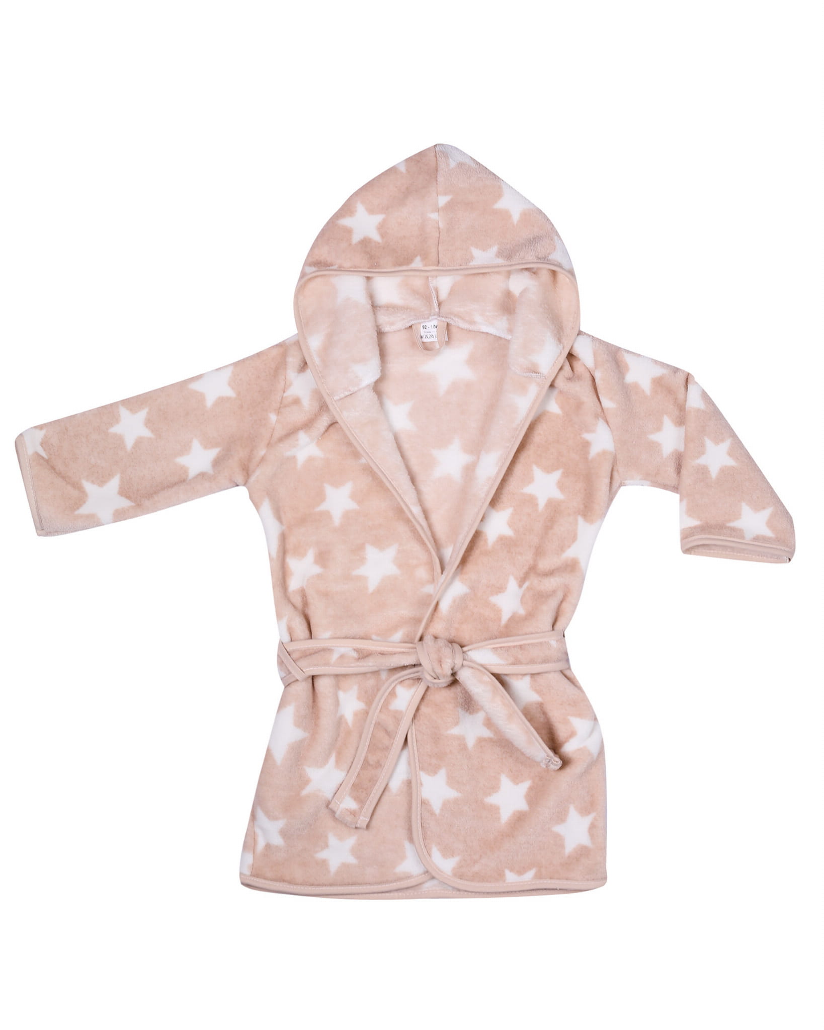 Miękki i przyjemny w dotyku szlafrok dziecięcy wykonany z ciepłego polaru, idealny na chłodniejsze dni i wieczory. Model wyposażony jest w praktyczny kaptur oraz pasek do przewiązania w talii, który zapewnia wygodne dopasowanie. Delikatny wzór w gwiazdki nadaje mu uroczego, dziecięcego charakteru. Doskonały po kąpieli, na poranki i wieczorny relaks.